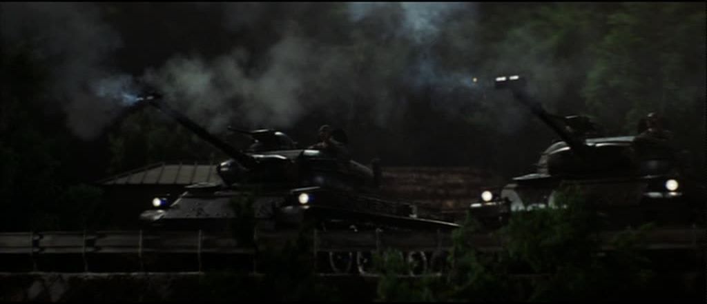 Überraschend ist, wie brutal „Frankenstein – Zweikampf der Giganten“ stellenweise ist. Von der oben bereits beschrieben Szene, in der der „Grüne“ Menschen wie kleine Snacks einwirft, abgesehen, sind auch die Szenen, in denen er vom Militär attackiert, wird nicht ohne. Die Geschosse reißen große Wunden in seinen Körper, stellenweise beginnt er zu brennen. Natürlich ist das alles kein Splatter-Niveau und die großen Wunden sind nur rote Flicken auf dem Affenkostüm, aber ich kann mich nicht erinnern, in einem Kaiju das Monster jemals so leiden gesehen zu haben. Da passt dann auch die schöne, sentimentale Szene, in der der gute „Braune“ seinem verletzten Bruder/Sohn/Ableger aufhilft, als dieser schwer verwundet am Boden liegt. Auch wenn die Beiden sich zunächst gut verstehen, bleibt es nicht bei dieser Eintracht. Etwas zu abrupt erkennt der „Braune“ offenbar, was für ein Kuckucksei er sich hier eingefangen hat und beginnt den „Grünen“ mit einem Baum zu verprügeln. Das ist zwar vom Drehbuch etwas holprig gelöst, bereitet aber das große Showdown vor, in dem sich die beiden wie Wrestler durch die Gegend werfen. Ebenfalls merkwürdig mutet das kuriose Finale an, in dem ein plötzlich und scheinbar grundlos auftauchender Unterwasser-Vulkan eine wichtige Rolle spielt. Auch eine viel zu lange Szene, in der eine Nachtklub-Sängerin ein Lied zum Besten geben darf, wirkt etwas gezwungen und bringt den Film unnötigerweise zum Stillstand.