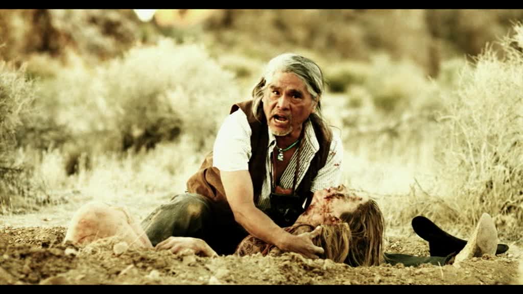 Weiterhin muss der Film mit ziemlich miesen CGI kämpfen. Da diese aber recht sparsam eingesetzt werden (z.B. wenn der Geist des Häuptlings sichtbar gemacht wird oder ein Autostunt am Rechner simuliert wird) und ansonsten häufig auch auf gute alte Handarbeit gesetzt wird, lässt sich dies allerdings verschmerzen. Aufdringlicher wirkt da schon der Darsteller des alten Indianers, der Zoe ins untote Leben zurückholt. Dieser spielt so schlecht, dass seine Darstellung als reiner Trash durchgehen muss. Allerdings muss man ihm zugute halten, dass seine Rolle auch recht undankbar geschrieben ist. Generell muss auch festgehalten werden, dass der heilige Ernst mit dem „Savaged“ zur Sache geht, stark im Kontrast zur überdrehten Geschichte steht, die immerhin einige sehr übertrieben-splatterige Szenen (wie z.B. oben erwähnte Darmstrangulation) aufweist. Da wirken dann die tragisch-romantischen Momente zwischen Zoe und ihrem Verlobten Dane auch eher pathetisch denn dramatisch.