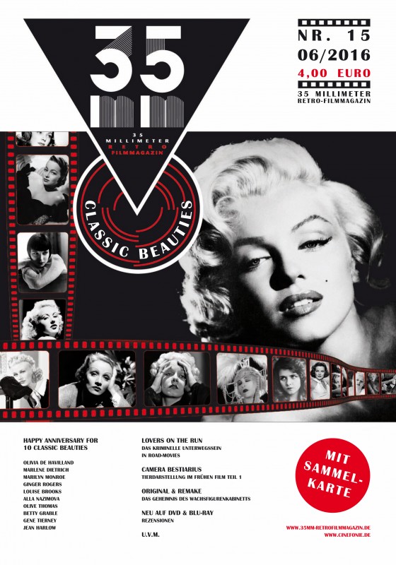 Und wieder ist eine neue Ausgabe des „35 Millimeter“-Magazins fertig. Und es ist, wie ich finde, diesmal eine besonders schöne Ausgabe geworden. Nicht nur wegen des entsprechenden Titelthemas. Ich habe diesmal drei Artikel am Start: Zunächst geht es um die beiden düsteren Psycho-Thriller „Lady in a Cage“ und „Wiegenlied für eine Leiche“ in denen Olivia de Havilland die Hauptrolle spielt. Daran schließt sich dann ein ausführliches Portrait der ehrenwerten Dame an, die mit 100 Jahren nun der älteste, noch lebende Star aus Hollywoods goldenem Zeitalter ist. Ferner habe ich mir noch die platinblonde Sexbombe Jean Harlow vorgenommen. Ein Artikel, auf den ich schon so ein kleines bisschen stolz bin. Die Kollegen war aber auch wieder gut drauf, und darum kann ich das Heft aus vollstem Herzen empfehlen.